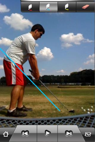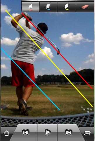 The iSwing app includes the ability to perform analysis on the image. Users can click to show a lagged frame view or draw in lines for planar analysis. The shots below show video playback of my swing including the analysis lines (nice and parallel =)).