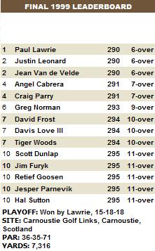 So, let me start at the top: The course. Carnoustie. One of the nastiest, craziest, unbelievable courses in the whole world. There are burns, blinds, crazy winds, small targets, pot bunkers, tight fairways, and hazards everywhere. People forget how bad it was: in a major championship, with the best golfers in the world playing, Van de Velde’s gaffe put him from +4 to +6. That’s right: a 3-way playoff at 6-over-par!! Tell me that course wasn’t hard. Garrigus finished at -10. Tell me that TPC Southwind is more difficult.