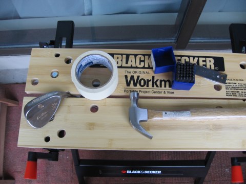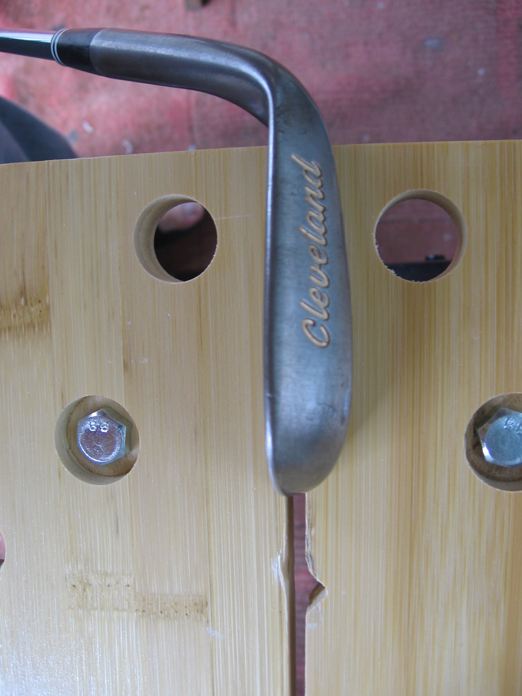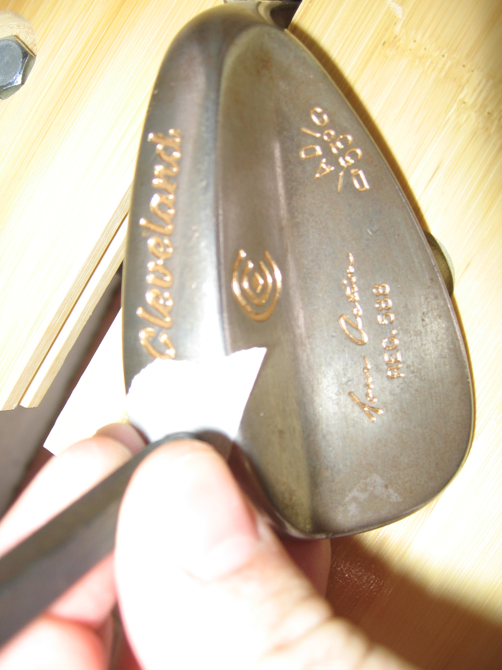 My goal in this first stamping project was to stamp the number “53” on the bottom of my gap wedge, because I regularly grab it instead of the lob wedge or vice versa–they look the same when in the bag. Thus, I clamped the club in by the neck….but….