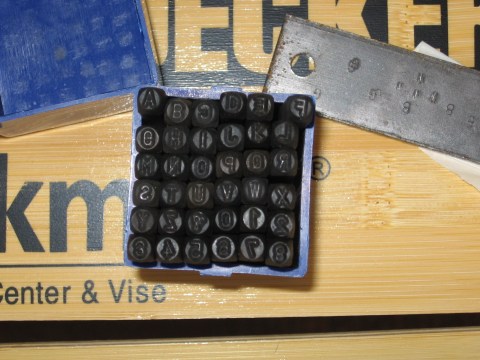 I trolled eBay for the cheapest stamp set I could find and ended up with one that was $16 shipped. If you go to buy your own stamp set, make sure you check with the sellers to ensure that your stamps can be used on steel. Many of the stamps on eBay are designed for jewelry applications, which involve MUCH softer metals (gold, silver, etc.).