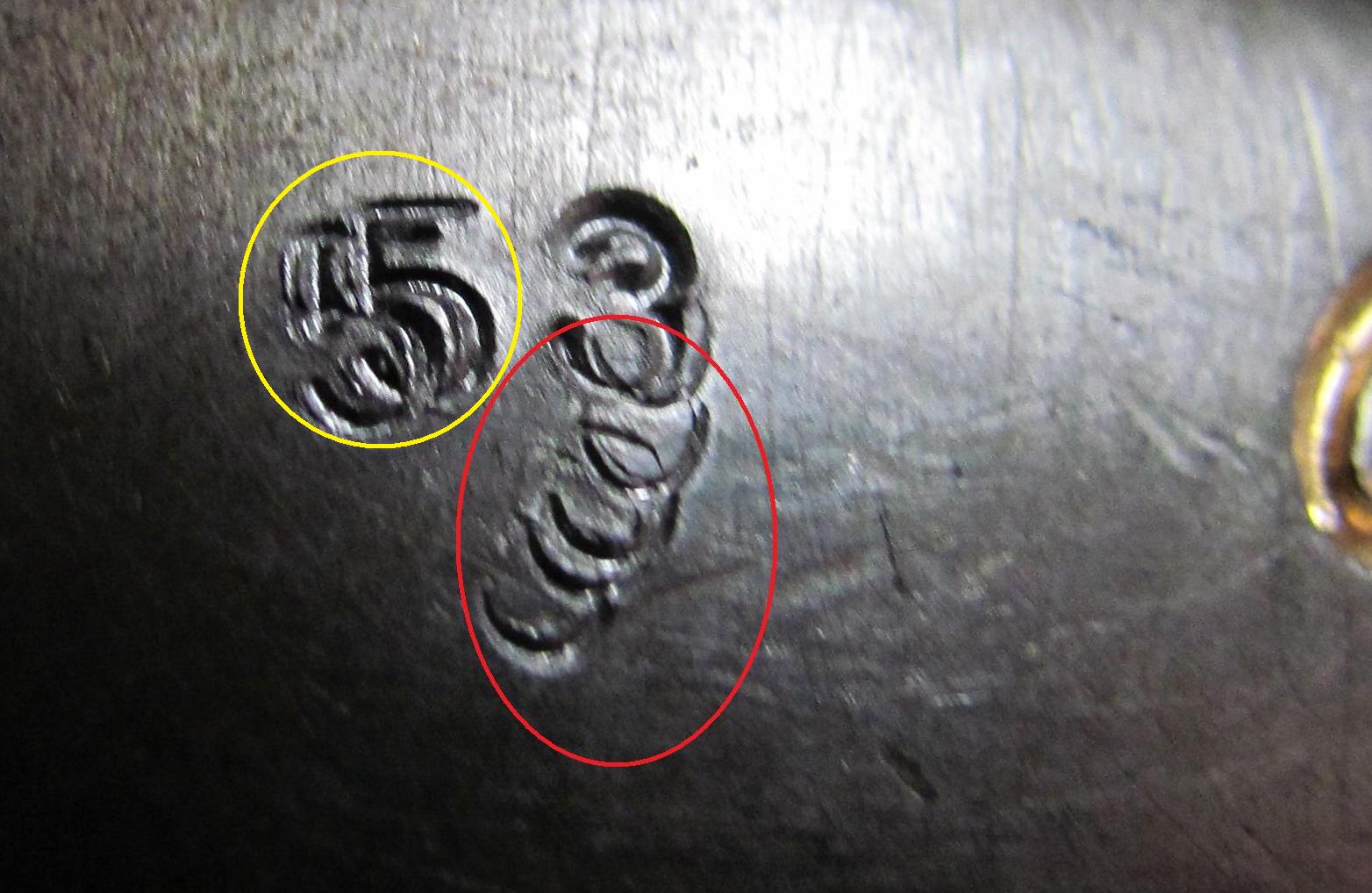 A couple of things I learned from this. As you can see below in the red oval, the bottom of the “3” is moving down the club. This was a result of the bad clamping, which I discussed above. With each hammer strike, the club moved a little. Once I reclamped it on the blade, it was OK, and I was able to get the deep 3 located above the red oval.