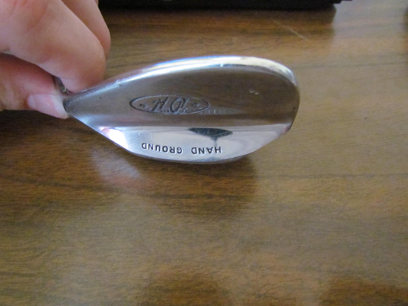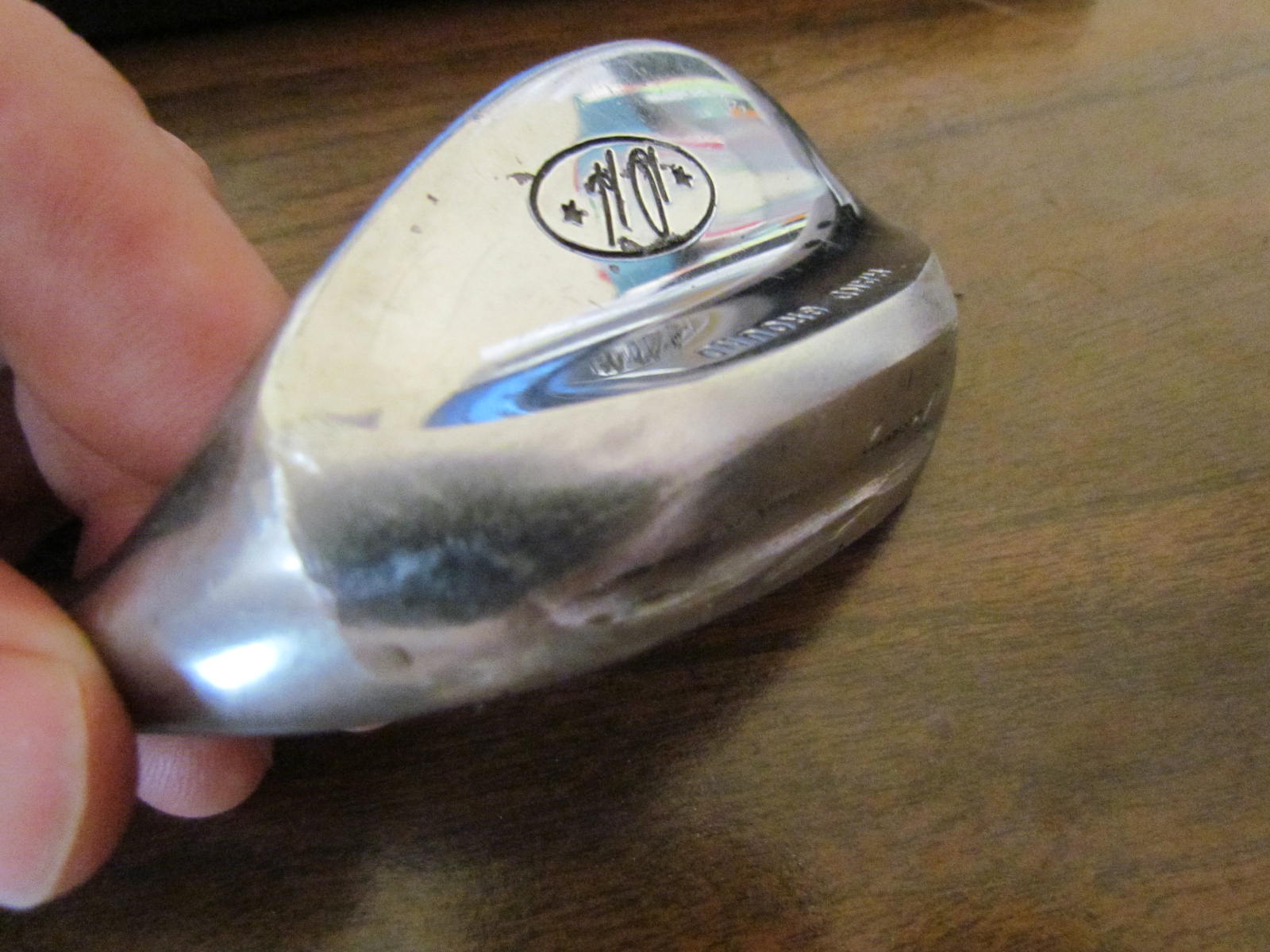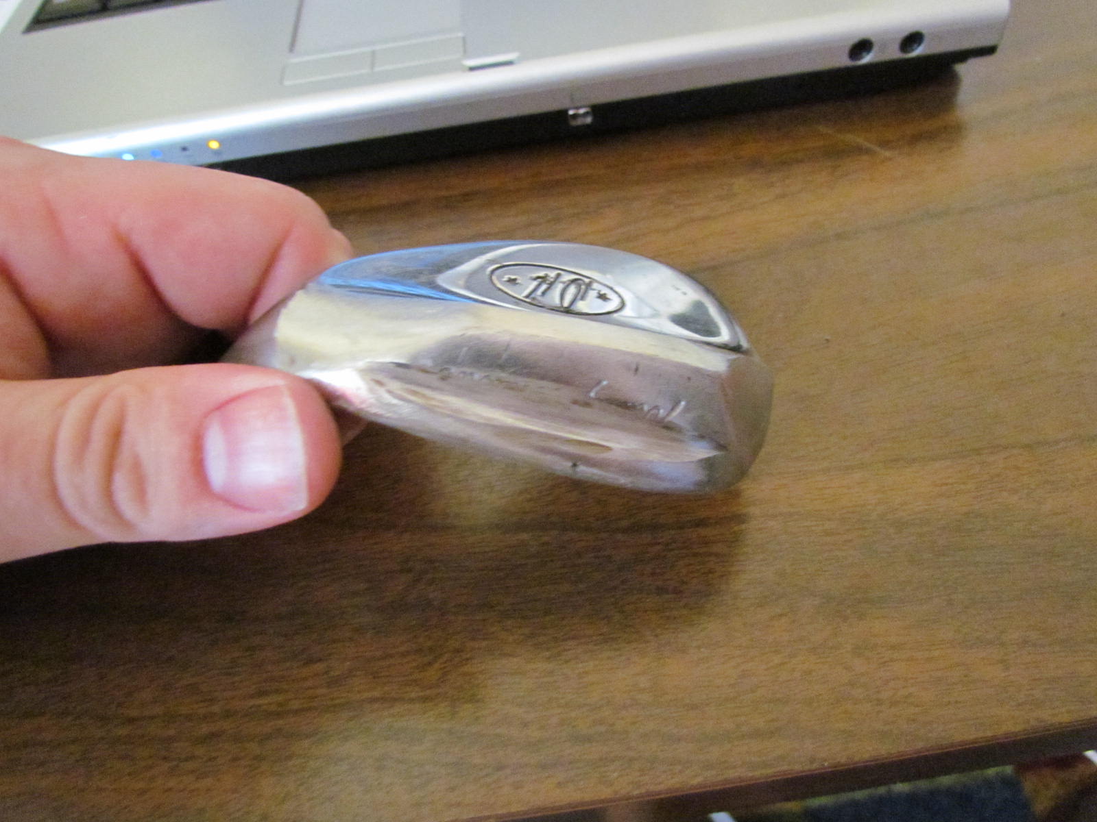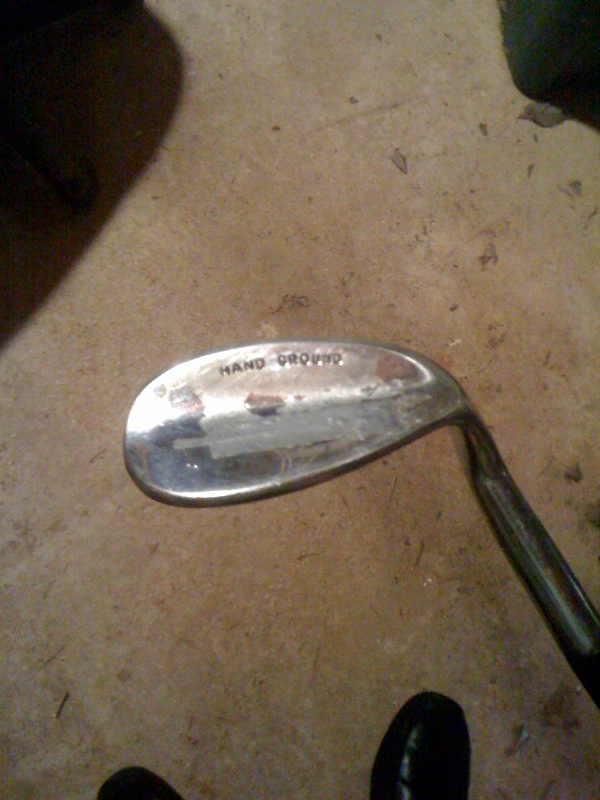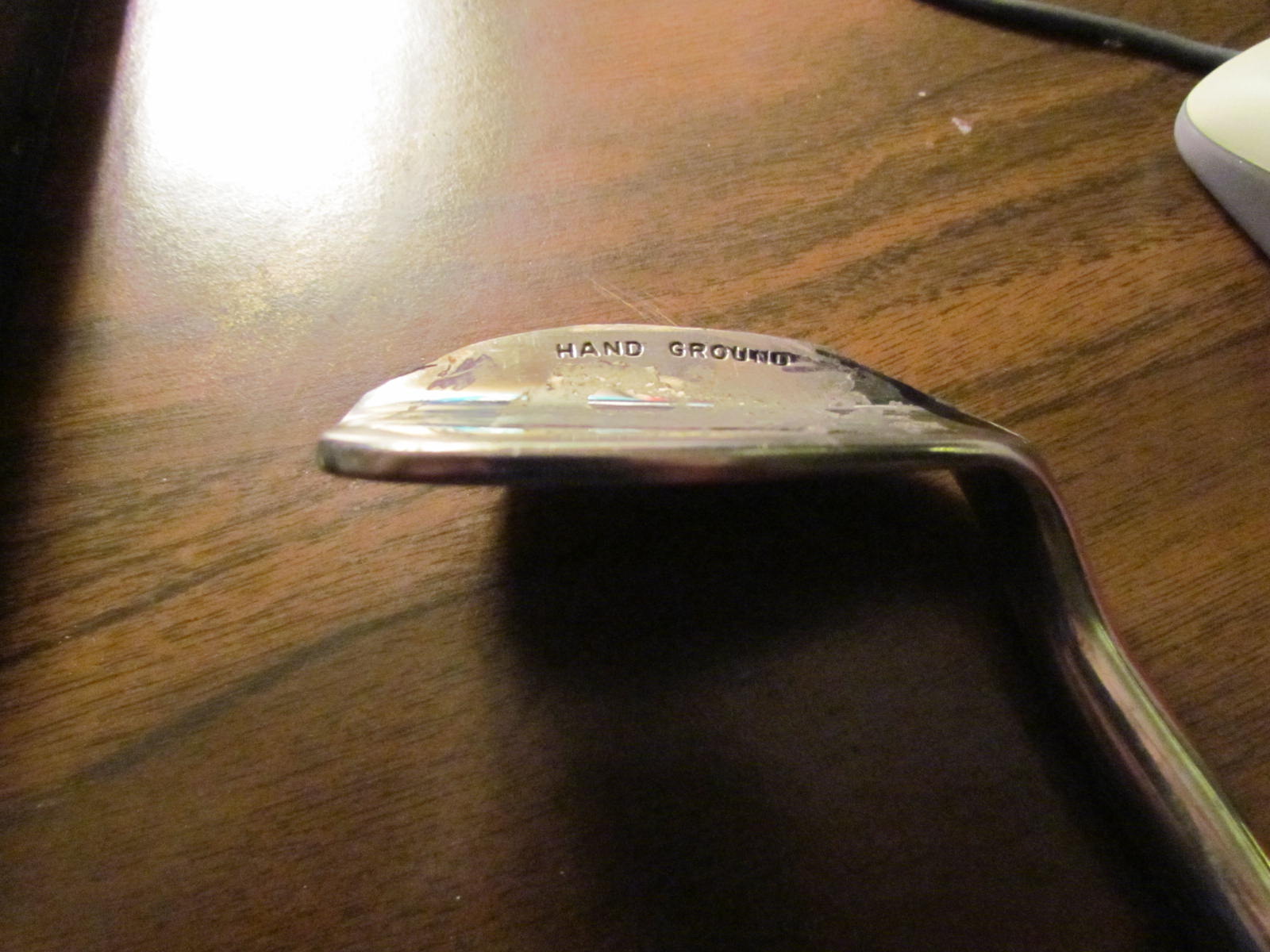 I started with an old wedge–Tommy Armour. It had an ungodly amount of bounce, so I decided it was a good test piece. If you don’t have a wedge you want to sacrifice, Golfsmith sells grinding blanks for $10/head (see http://www.golfsmith.com/products/SE2886/Snake_Eyes/Custom_Grind_Wedge_Head). Pics of my starting wedge below: