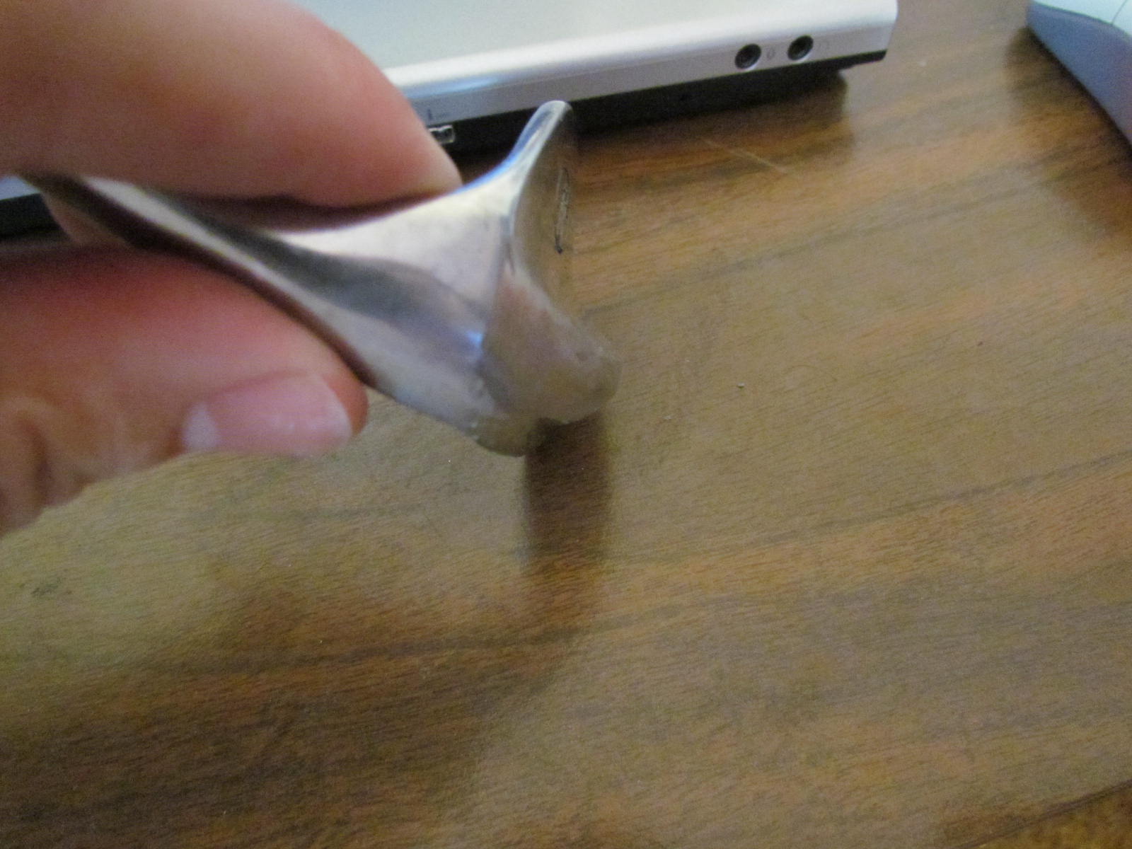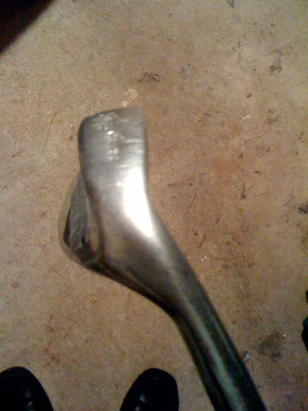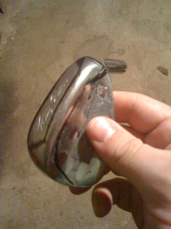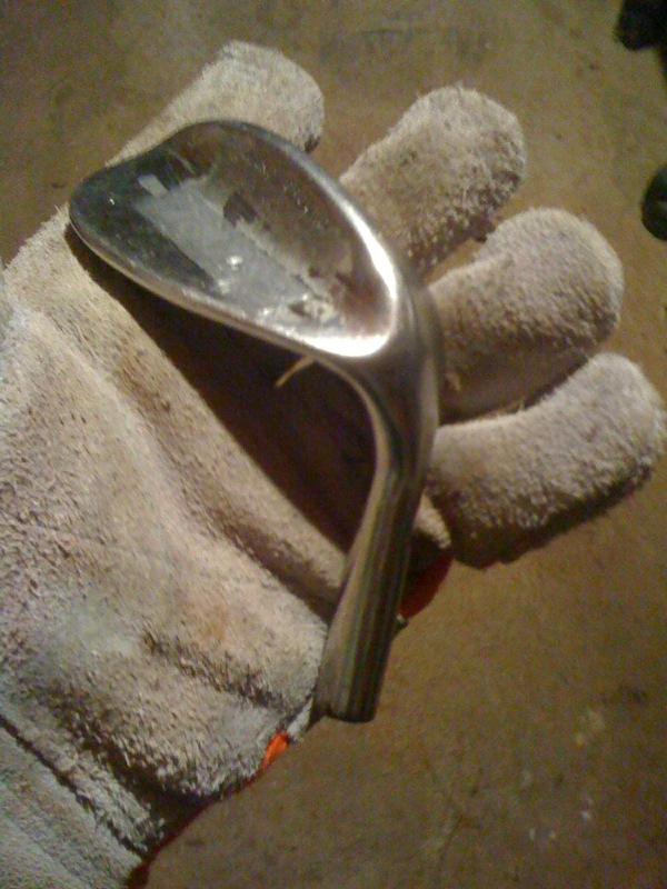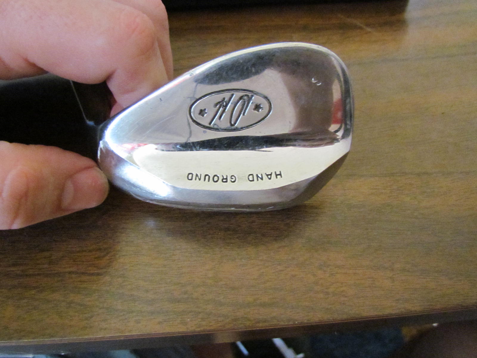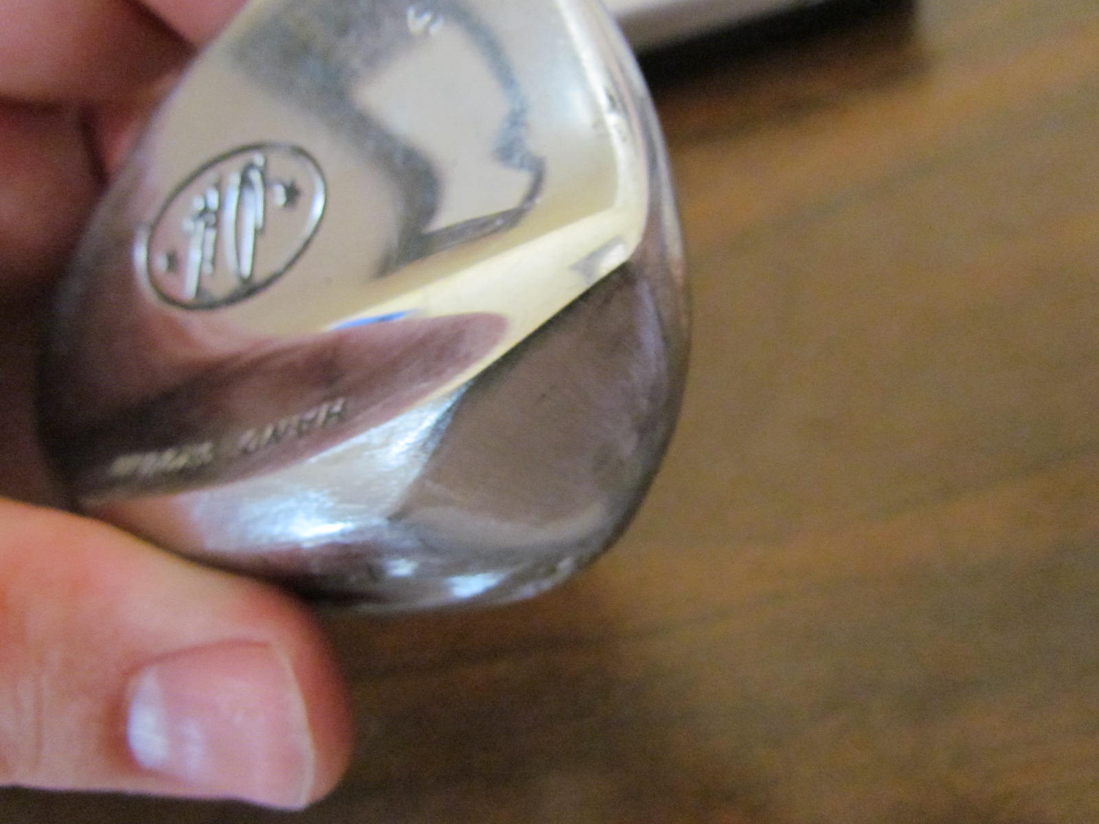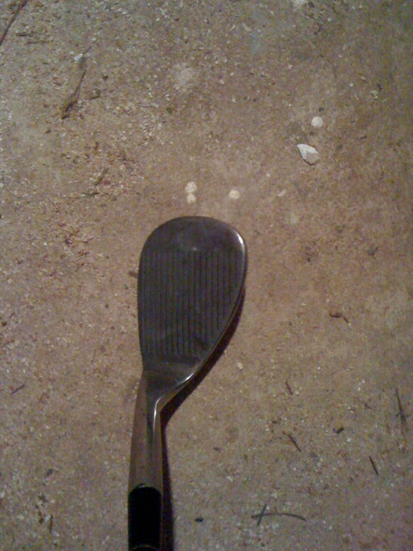 I started with an old wedge–Tommy Armour. It had an ungodly amount of bounce, so I decided it was a good test piece. If you don’t have a wedge you want to sacrifice, Golfsmith sells grinding blanks for $10/head (see http://www.golfsmith.com/products/SE2886/Snake_Eyes/Custom_Grind_Wedge_Head). Pics of my starting wedge below: