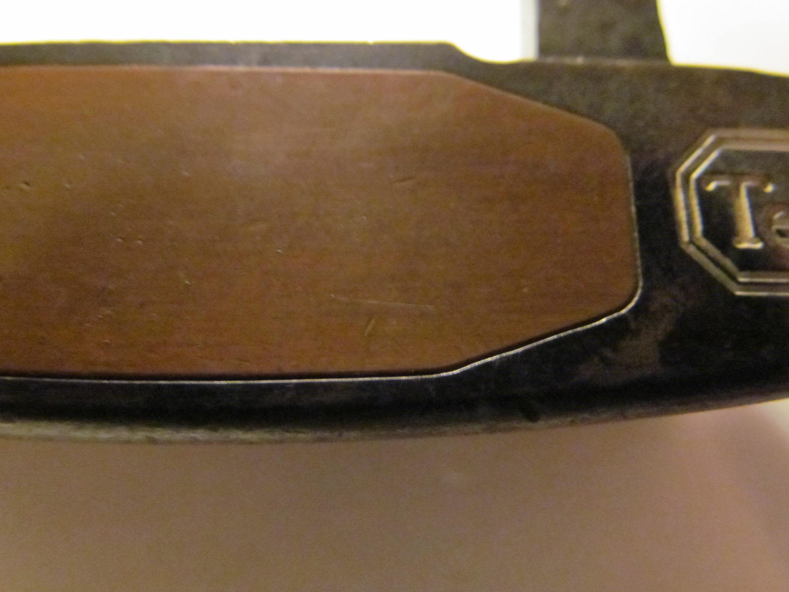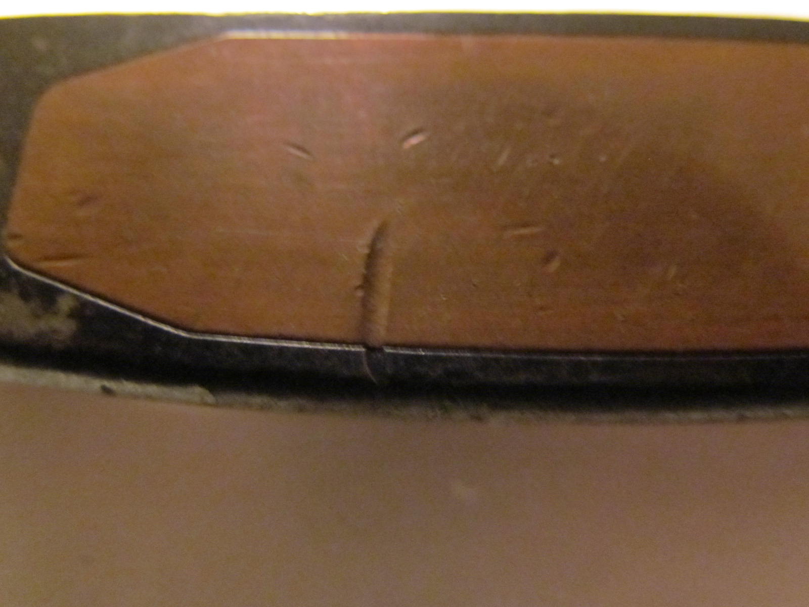 Then, you blue it with B/C. In my experience, this was awful. I could never get it dark enough to make it look like either (1) original or (2) how the OP on WRX did. You have to put the gun blue on, then wait 30 seconds, wash with cold water, then smooth with steel wool, then rub with degreaser (I used Simple Green), then wash the degreaser off with cold water, then dry with a hairdryer until bone dry, and then reapply until the color is as dark as you want. However, I got to the point where I would put the blue on, work with the steel wool, and the color would come right back off with the steel wool. I finally resigned myself to the fact that it wasn’t going to get any darker and it looked OK as a light brown finish. After some more smoothing with steel wool, I cleaned it, oiled with baby oil, and degreased to make a nice clean surface. I put in the elastomer (as per the WRX post), screwed the insert in, and cleaned off. Then I applied the white “paint fill” (nail polish) and the gold paint fill (gold instead of copper because I had some gold lying around). The result is below: