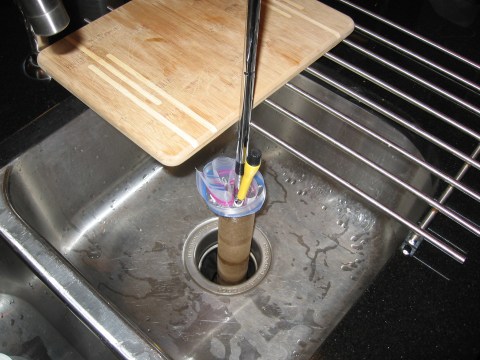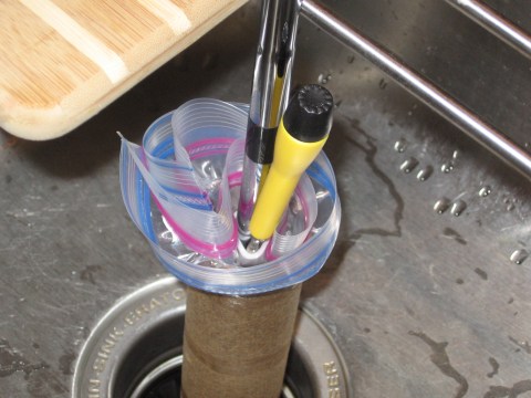 To do this, I took the large plastic bag, and put it over the grip end of the shaft. I placed the bag and the putter grip (still over the end of the shaft) into the paper towel roll as a means to restrict the expansion of the bag, thereby requiring as little mineral spirits as possible into the bag. I then filled the bag up with mineral spirits until the level of the fluid was higher than the edge of the grip. I let it sit for 20 minutes to allow it to “soak in.” See photos below.