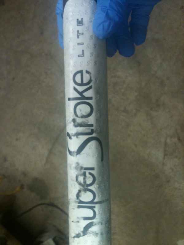 What I failed to realize is that the mineral spirits does not penetrate well. I’ve heard of others using WD-40 because it penetrates small spaces better and contains mineral spirits in it–I might try that next time. Regardless, my vision of the grip slipping off with ease was nowhere near reality. Instead, I worked the mineral spirits down into the grip using a screwdriver to GENTLY pry away the grip from the shaft (be careful–I’ve broken more than one grip trying to do this). Eventually, enough got in that I was able to twist some parts of the grip relative to the shaft. I worked at it for 15 or so minutes, which was an enormous amount of effort. Eventually, the grip came loose.
