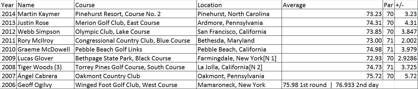 2014 | Martin Kaymer | Pinehurst Resort, Course No. 2 | Pinehurst, North Carolina | 73.23 | 70 | 3.23