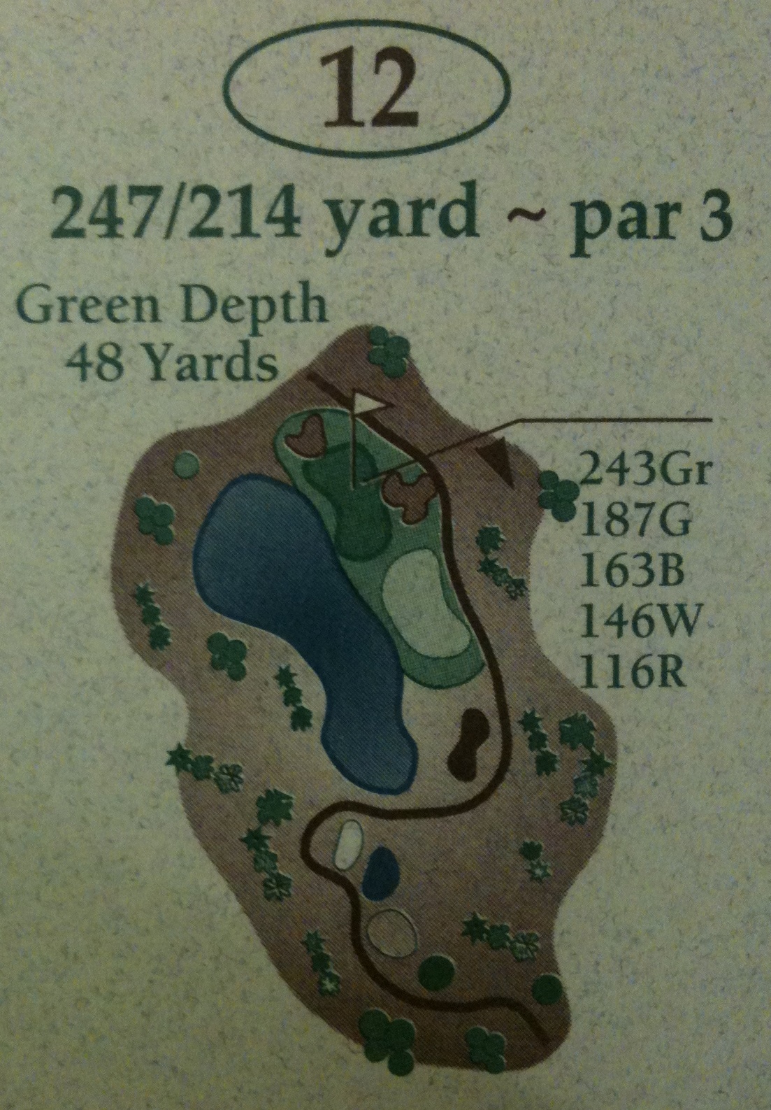 The twelfth (yardage guide and picture above from the tee) measures a stout 247 yards from the Green Tee. This monster of a par 3 affords very little in the way of forgiveness. Water left, bunkering right, and the only real bailout short into a collection area make this truly a “heroic” school of design hole. Oh, lets not forget the head wind. As if this beast was not enough pressure on its own, two of the cart boys had made their way down to watch me tee off. I guess it is rare for them to see new blood around this course (much less anyone that could reasonably be called “new”). I carefully teed up my TaylorMade Penta and gave it as smooth a ride as I could manage with my 3-wood. The instant it left the club face, I knew it was going to be pretty damn good. Below is the result that I drove up to after the long, 247 yard tee shot.