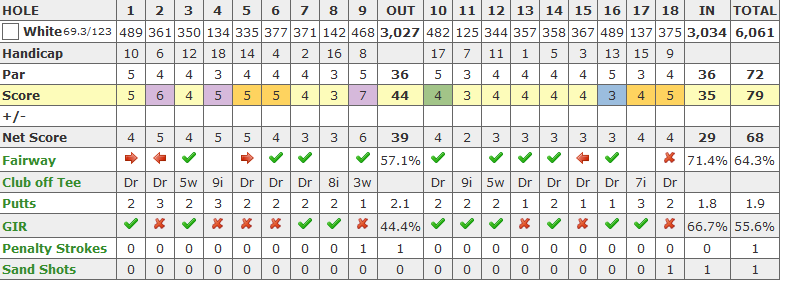 LOOK AT THAT BACK 9! I don’t think I’ve had a back 9 like that this year, and I’m a 1.5 handicap! An eagle (LG’s first), a two-putt birdie, and a -1 for the 9? Amazing. Plus, this guy shot 79 with 3 double bogeys AND three 3-putts. While it may look like he just passed the line, this is a huge breakthrough: clearly, he’s doing something he wasn’t before.